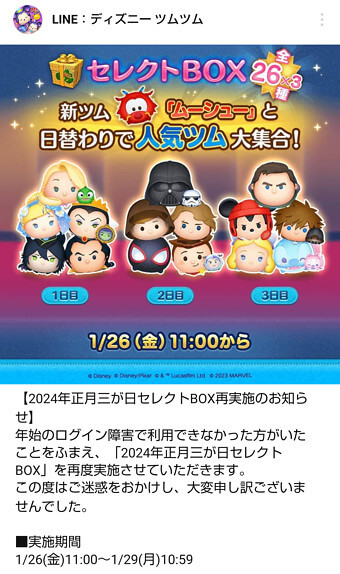 LINEディズニー ツムツム(Tsum Tsum)では2024年1月26日より正月三が日セレクトBOXが再実施されます。