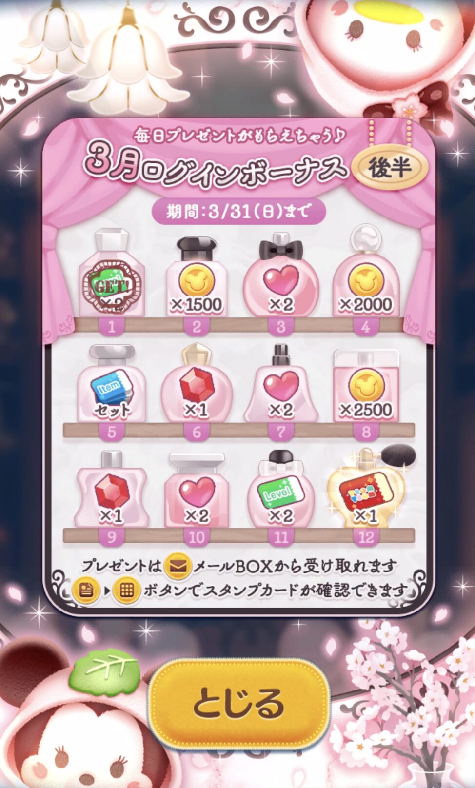 ツムツムログインボーナス3月後半はルビーやプレミアムチケット、コインやアイテムチケットセットなど含む全12回。