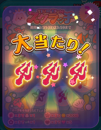 ツムツムスクラッチイベントはスクラッチを削って「槍マーク」が揃うと、以下の報酬がもらえます。