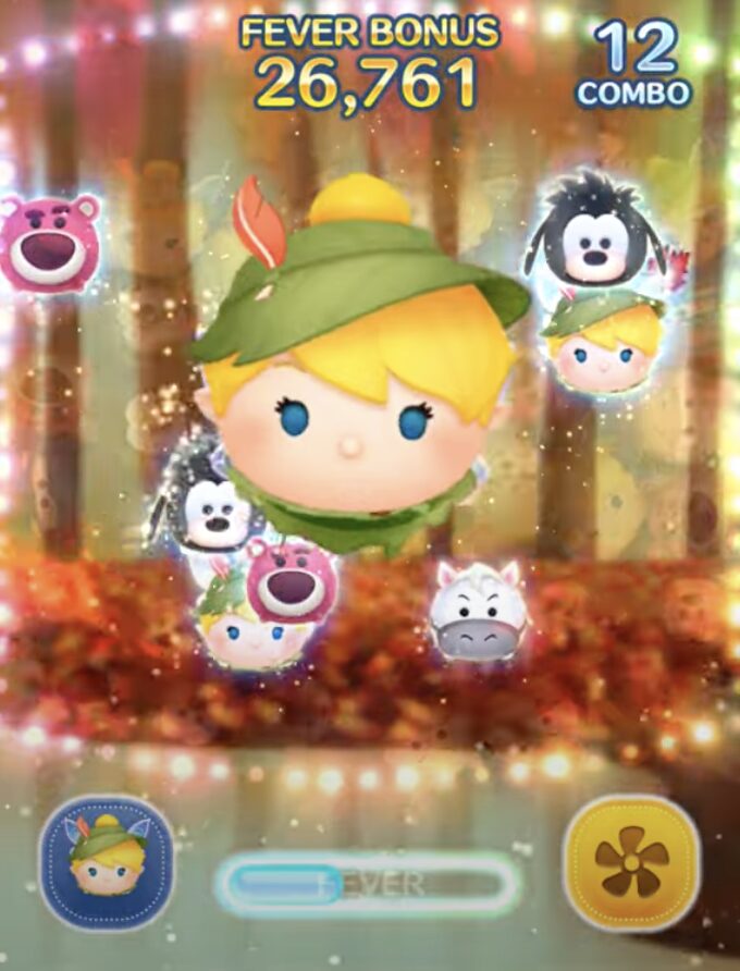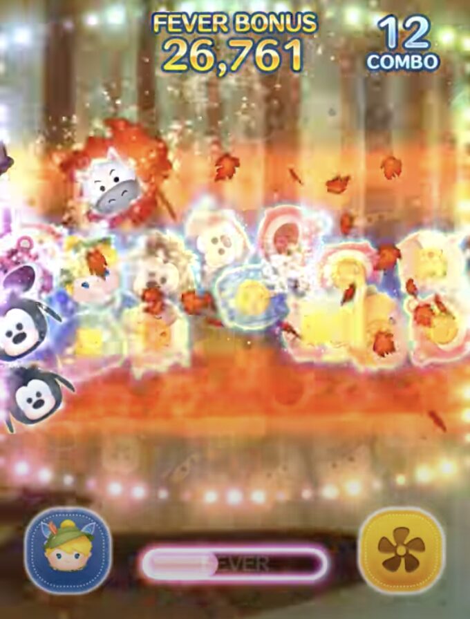 オータムティンカーベルは、ランダム+横ライン状にツムを消すよ!という2段階消去系スキル。