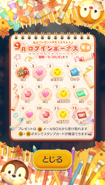 ここでは、9月ツムツムログインボーナス後半の概要と報酬内容一覧をまとめています。
