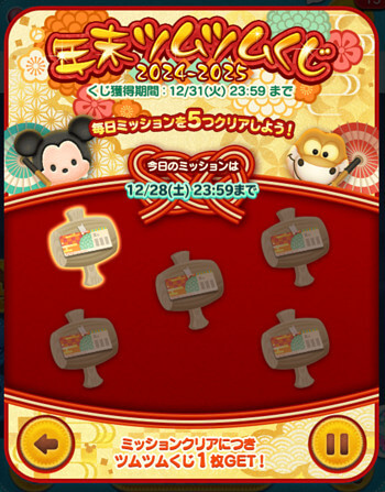 2024年12月26日~12月31日イベント「年末ツムツムくじ2024-2025」の12月28日では、毎日5個のミッションが出されます。