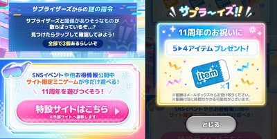 タイトル:11周年アニバーサリーキャンペーン内「サプライザーズからの謎の指令」