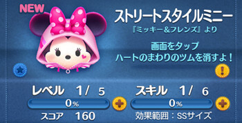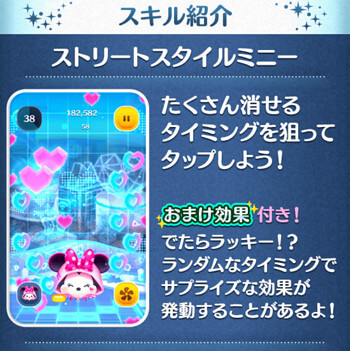 「ストリートスタイルミニー」のスキルは、「画面をタップ ハートのまわりのツムを消すよ!」という消去系スキル。