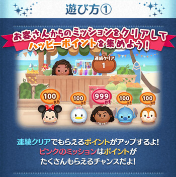 ツムツムのお店やさんでは、お客さんから出されるミッションをクリアしてポイントを貯めていきます。