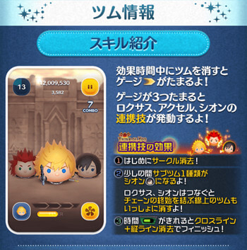 スキル名 | 少しの間ロクサスをつなぐとまわりのツムも消すよ! |