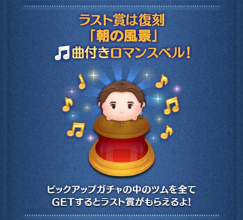 2025年6月ツムツムピックアップガチャ3回目はラスト賞に曲付きロマンスベルが登場。