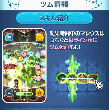 マレウスは、スキル効果中にツムを繋げると、マレウスを起点に縦ライン状にツムを消します。