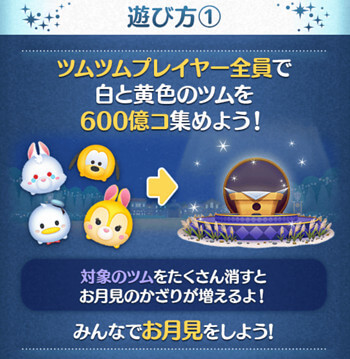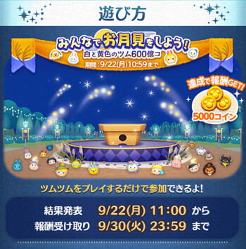 今回のイベントは、「みんなでお月見をしよう~白と黄色のツム600億個~」となっています。