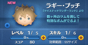 「ラギーブッチ」のスキルは、「数カ所のツムを消して特別なボムが出るよ!」という消去系スキル+ボム発生系スキル。