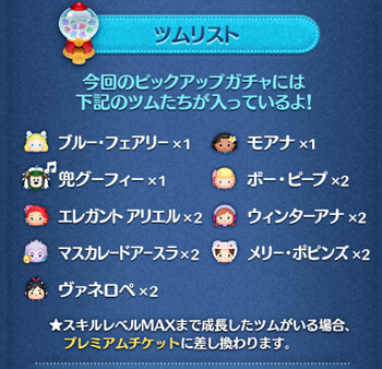 ちなみに、スキルマのツムがいる場合は、プレミアムチケットの確率が表示され、スキルマのツム数が多いほど、プレミアムチケットの排出率が高くなります。