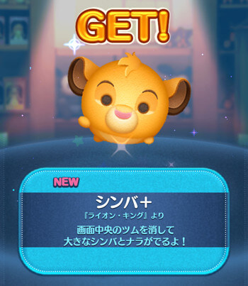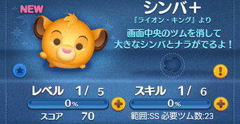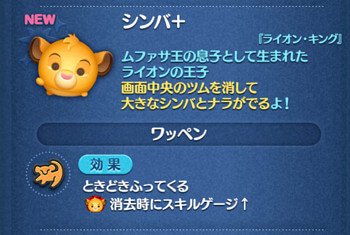 シンバ+は、画面中央のツムを消して大きなシンバとナラがでるよ!という消去系&大ツム変化系スキル。