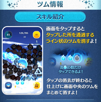 | スキル名 | 画面をタップするとタップしたところを通過するライン状にツムを消すよ! |