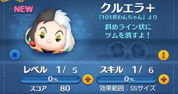 「クルエラ+」のスキルは、「斜めライン状にツムを消すよ!」という消去系スキルです。